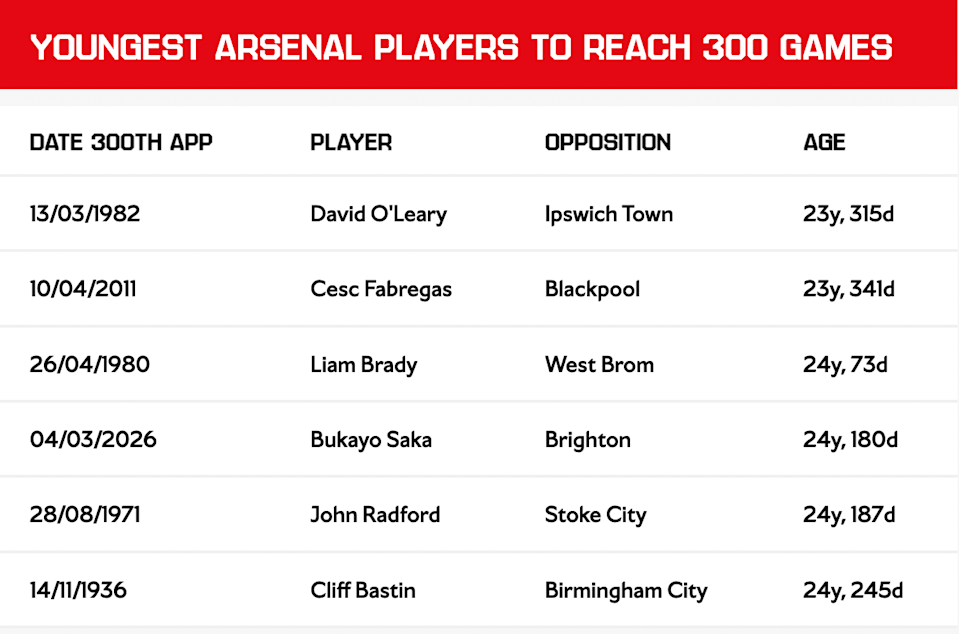 在今場英超阿仙奴作客對白禮頓的比賽,沙卡(Bukayo Saka)正選上陣,令他代表阿仙奴第300次。為紀念這里程碑,沙卡穿上的波衫,背後印有300。